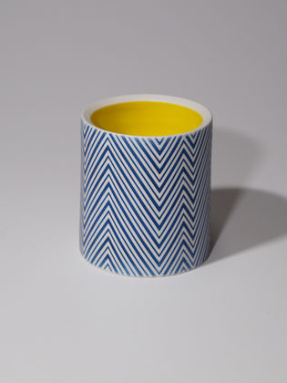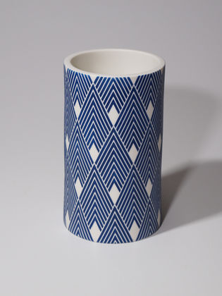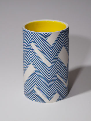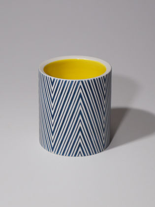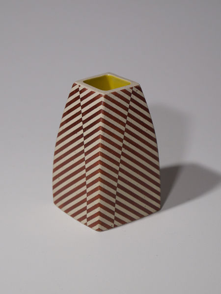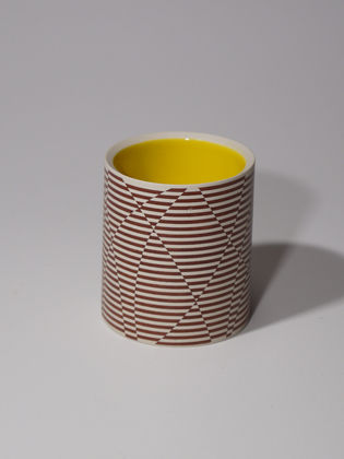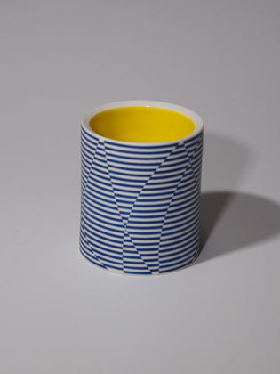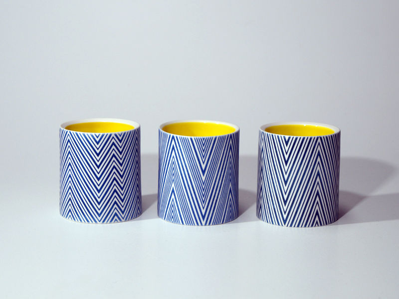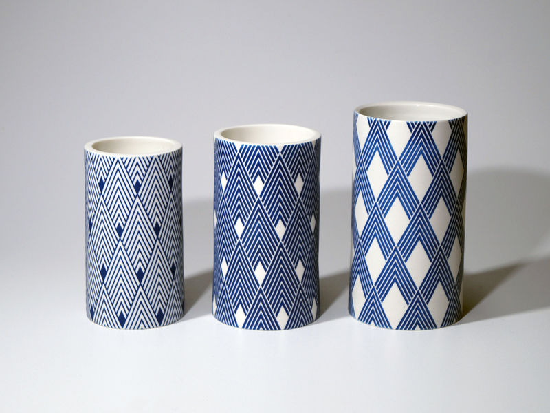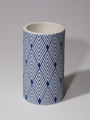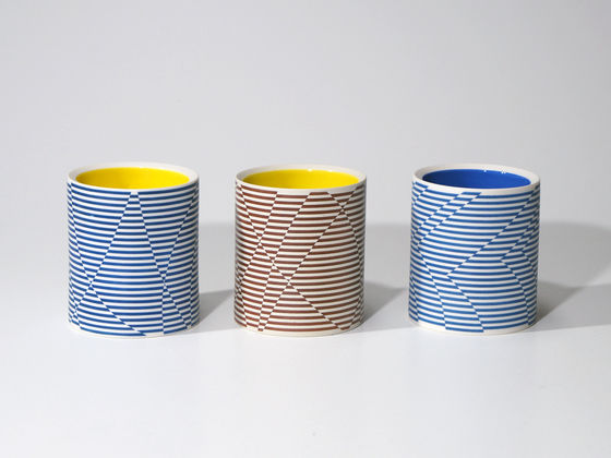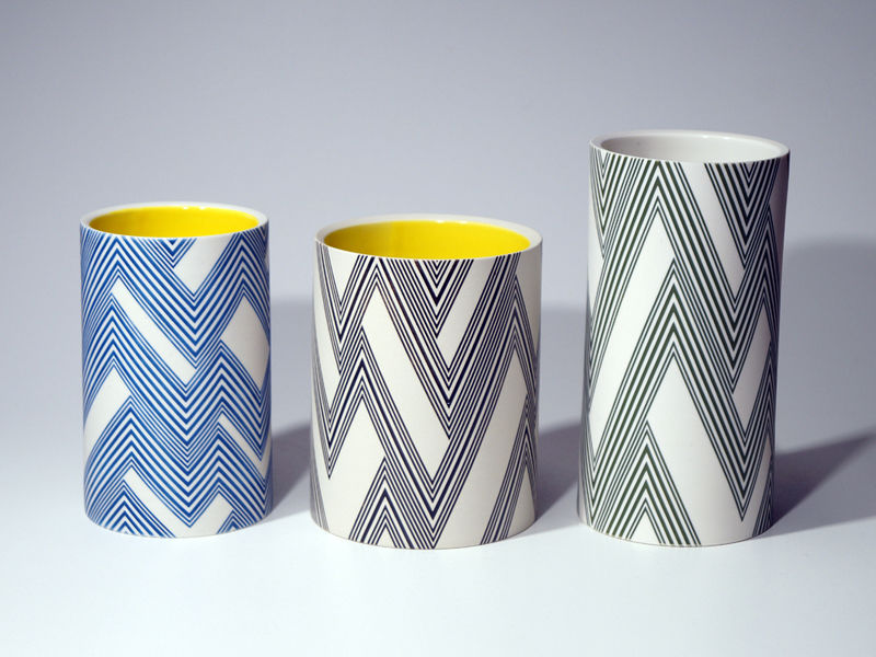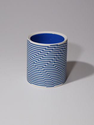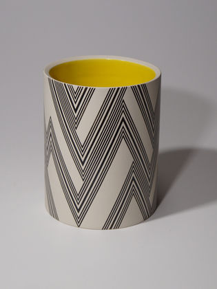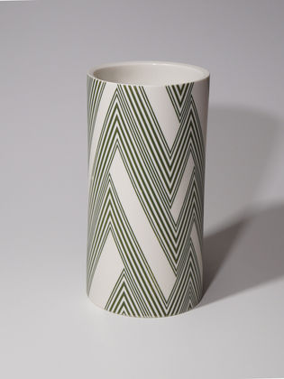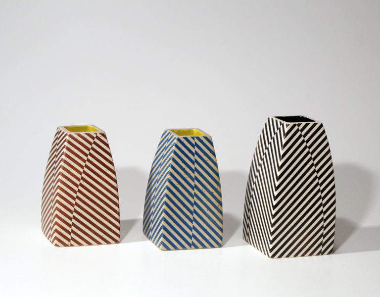 Die erstaunliche Perfektion der Gefäße von Mi Sook Hwang fasziniert und lässt uns rätseln: Holz, Lack, Keramik? Präzise graphische Muster aus eng gesetzten Linien überziehen einfache, zylindrische Keramikkörper ganz flächig, lösen sie visuell auf und provozieren optische Täuschungen. Die statischen Objekte scheinen durch ihre Oberflächen in Bewegung zu geraten.