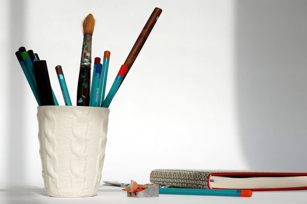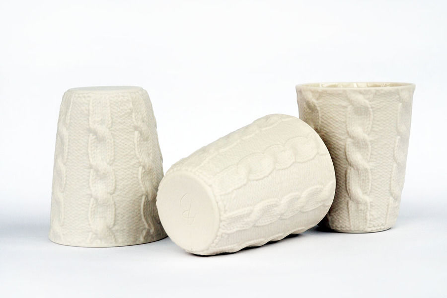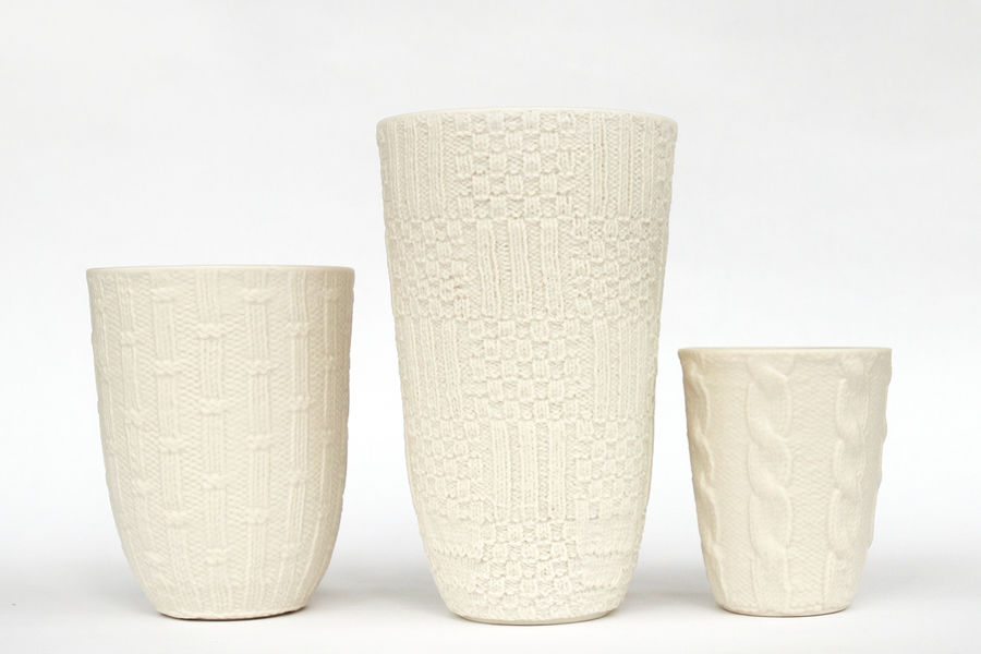 These latest vessel designs by Annette Bugansky from London were celebrated in international interior and design magazines. The full surprising but equally elegant effect of the delicate knitting patterns appear to great effect on the matt ivory surface of the porcelain. The textural structure on the outside of the cups with its play of light and dark on the surface invites the hand to explore.