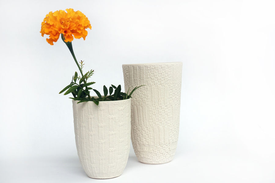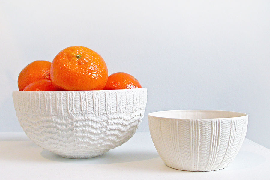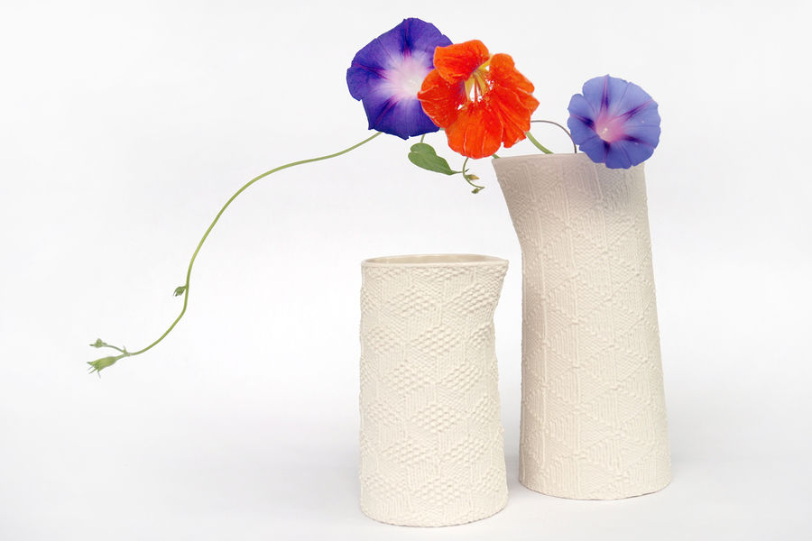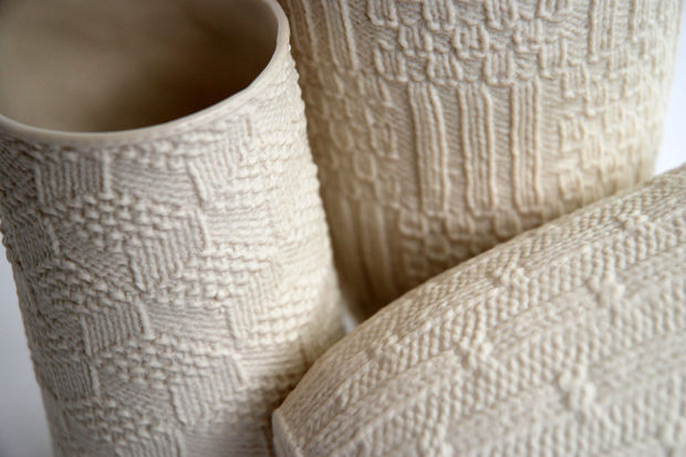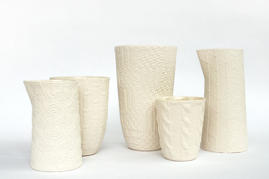 Her latest range of porcelain knitted texture pots combines traditional and experimental knitting patterns to create surface pattern. Porcelain has the ability to reproduce every detail and its translucent quality gives added depth. Most of her work is white and unglazed not wanting colour to detract from the delicate surface detail. The porcelain is vitrified at high temperatures to produce a matt watertight surface.