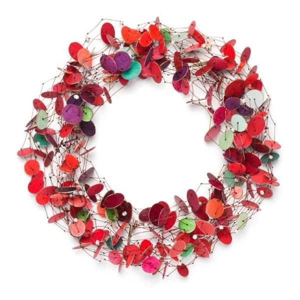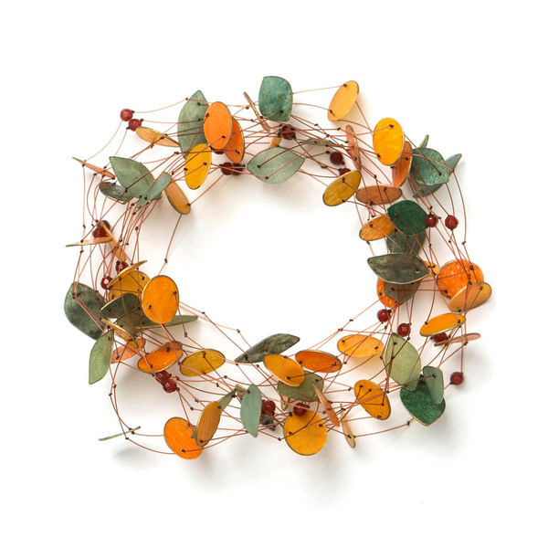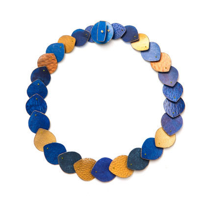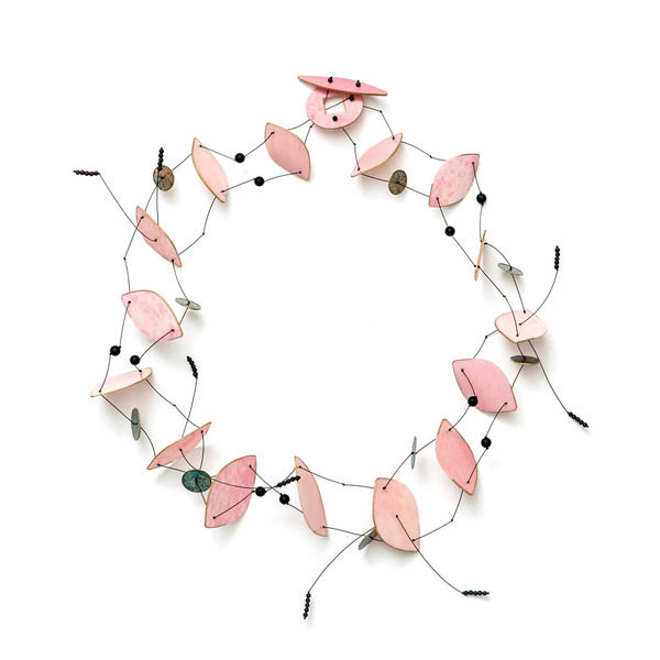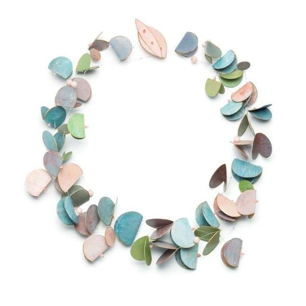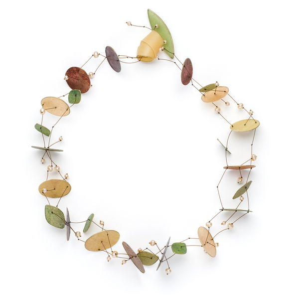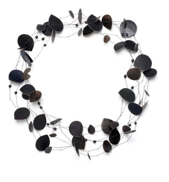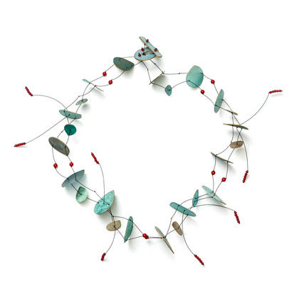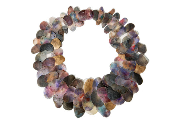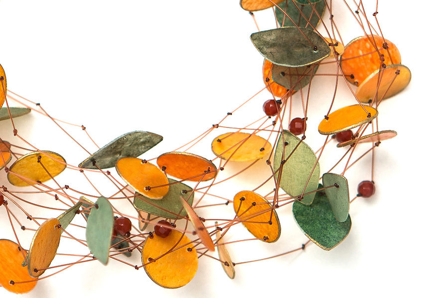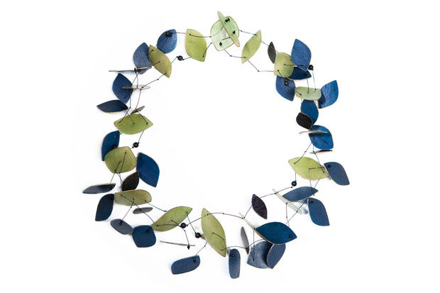 As three-dimensional graphics or natural-looking foliage, the necklaces play around the décolleté of their wearers. Each handcrafted piece of jewellery mysteriously varies a serial arrangement of forms, often accentuated by small beads and balls, or so-called "happy endings". The virtuous colour compositions play a leading role.