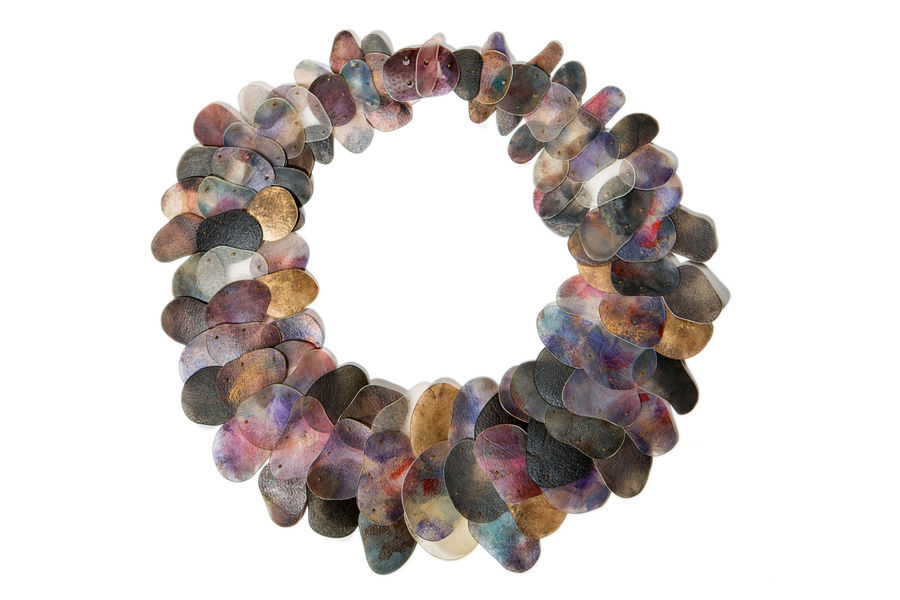 Precious parchment, its lively structure and colourfulness, transparency and lightness, inspires the jewellery designer Hilde Janich to create fascinatingly poetic jewellery. She lets subtle colour compositions trickle and rustle, play with the light and cast small shadows.
