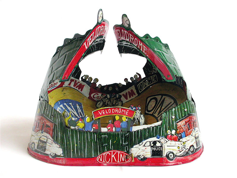 linocut printed tin, mounted, driving mechanism