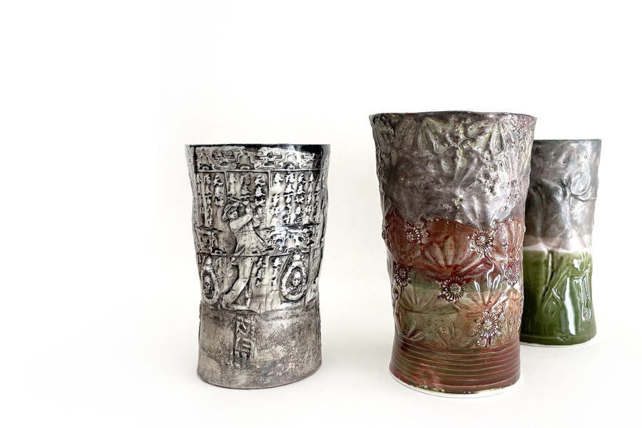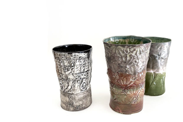 The ceramic artist Kati Jünger works with surfaces and reliefs. In the interplay of motifs, whose sources she can find everywhere, she reuses them and thus takes them away from transience - at least for this moment. In this way, she succeeds in creating exciting compositions of new narratives from outdated fragments, playing with decorative elements from the 1950s to the 1980s. She places insignia and badges of stands and associations, images and myths in a new context.