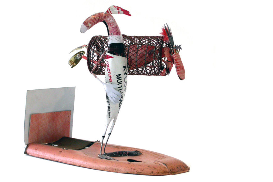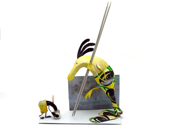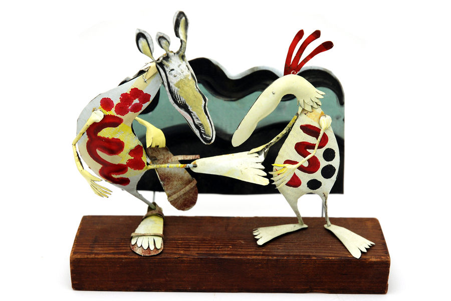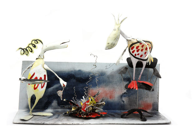 printed metals, wood and wire. Lively scenes are created, small dramas