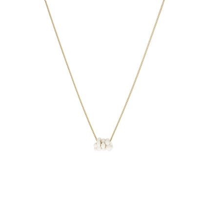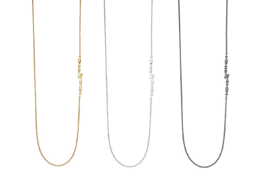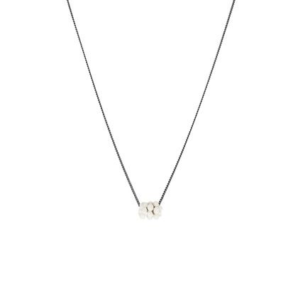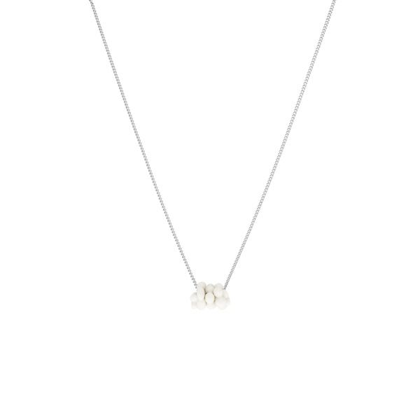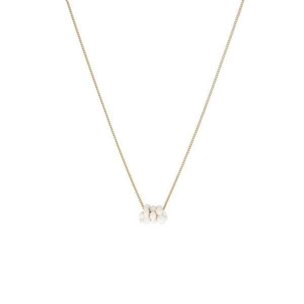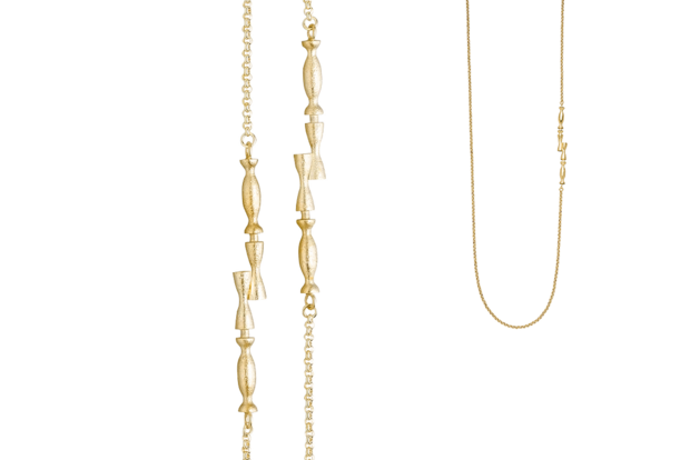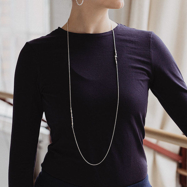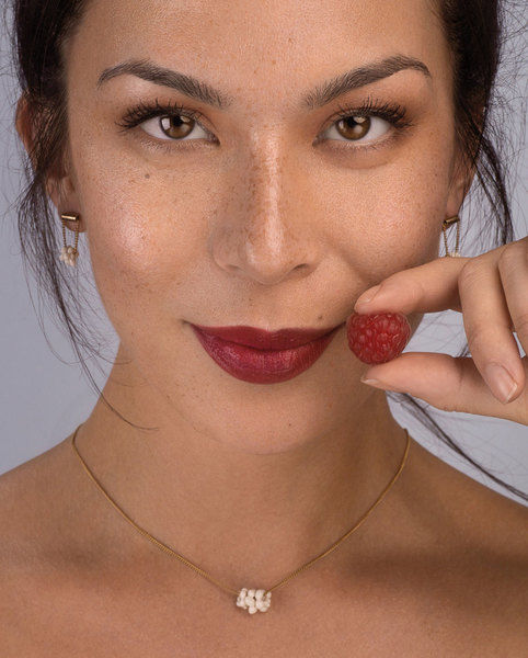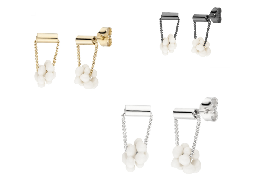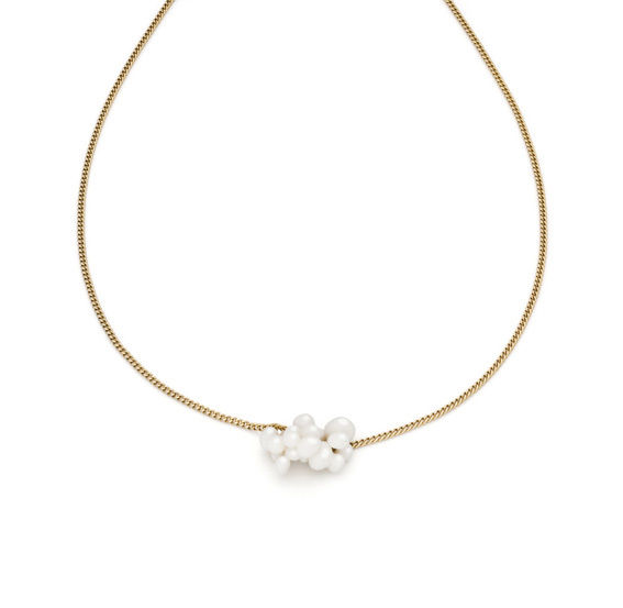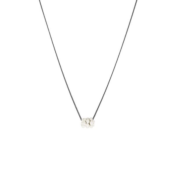 Her "Bicolor" necklaces are playing with the subtle colour contrasts of precious metals and with the difference of delicate chain structures. Like casually hand formed porcelain grapes evoke the crucial contradiction of the hand formed to the industrial made.