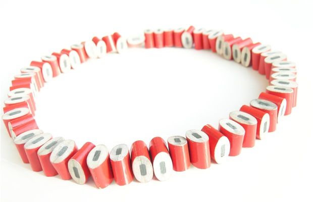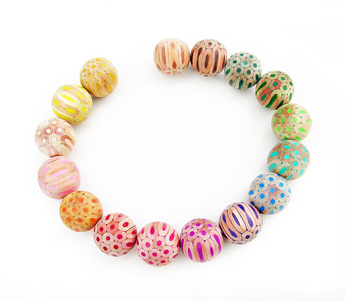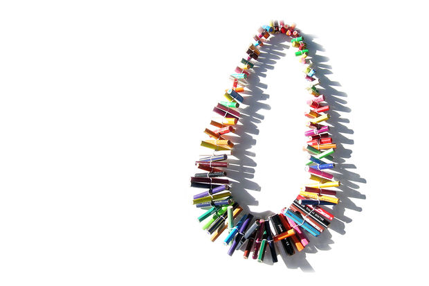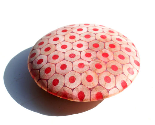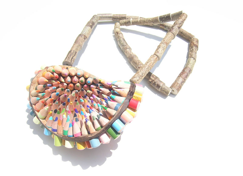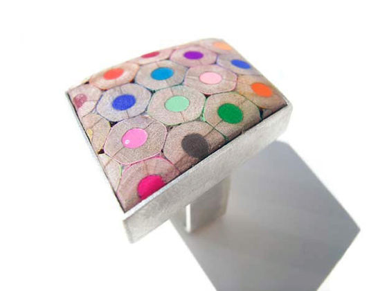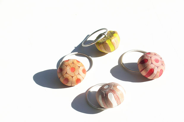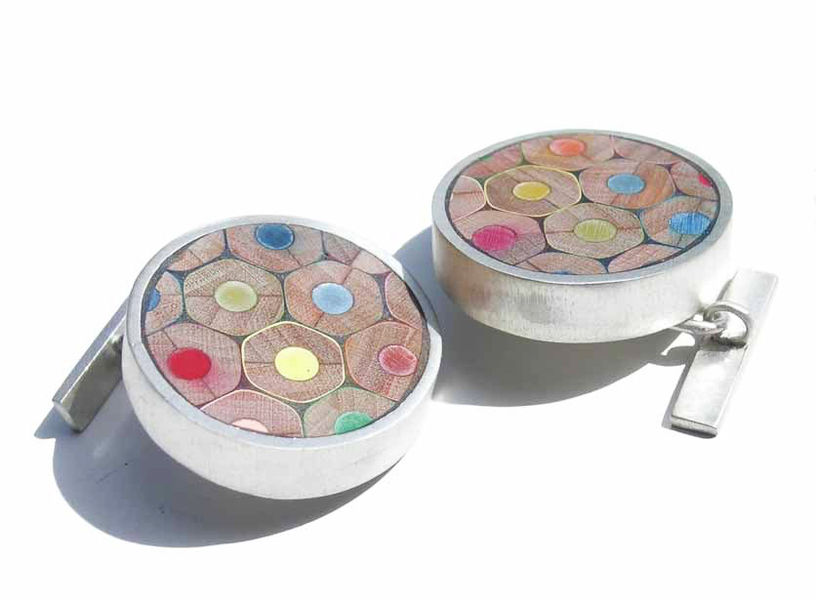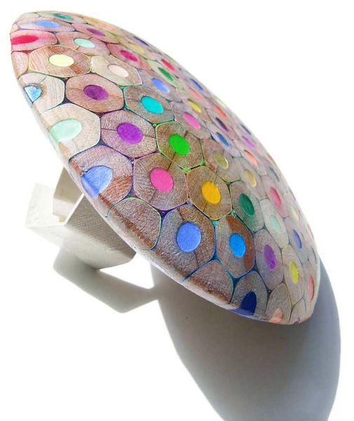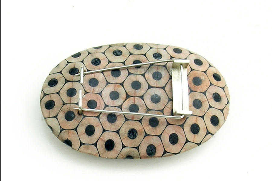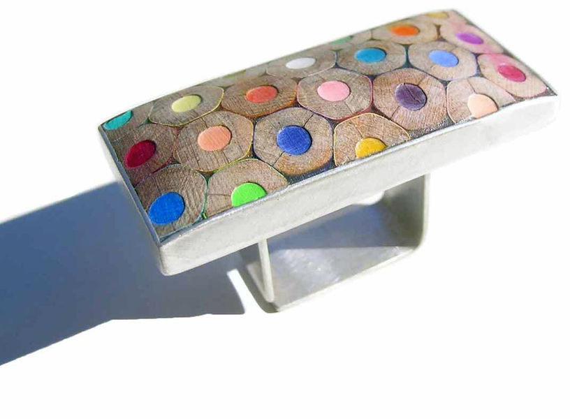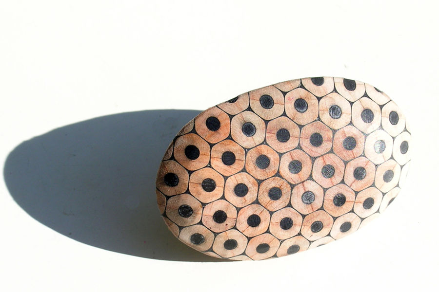 The ornaments created by composition of cut coloured pencils are of great variety. Cristina Bellucci is well known for her playful expeditions and very individual approach to jewellery making. The material coloured pencils brings a clear structure in her creations. Everyone of us has some positive associations to coloured pencils and so her jewellery pieces always are "eye catcher".