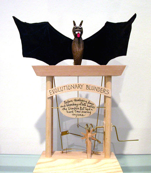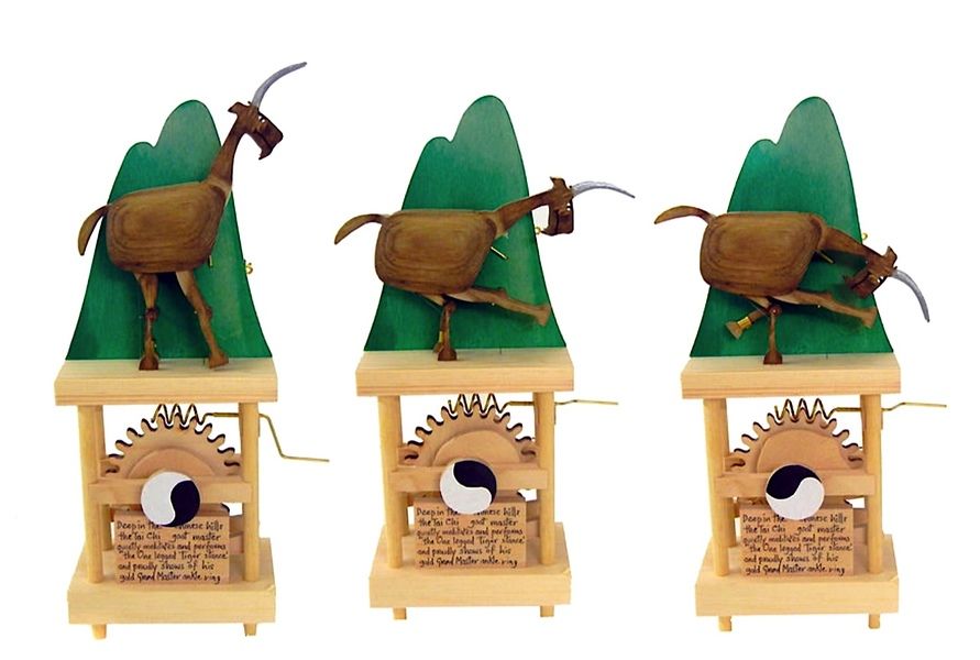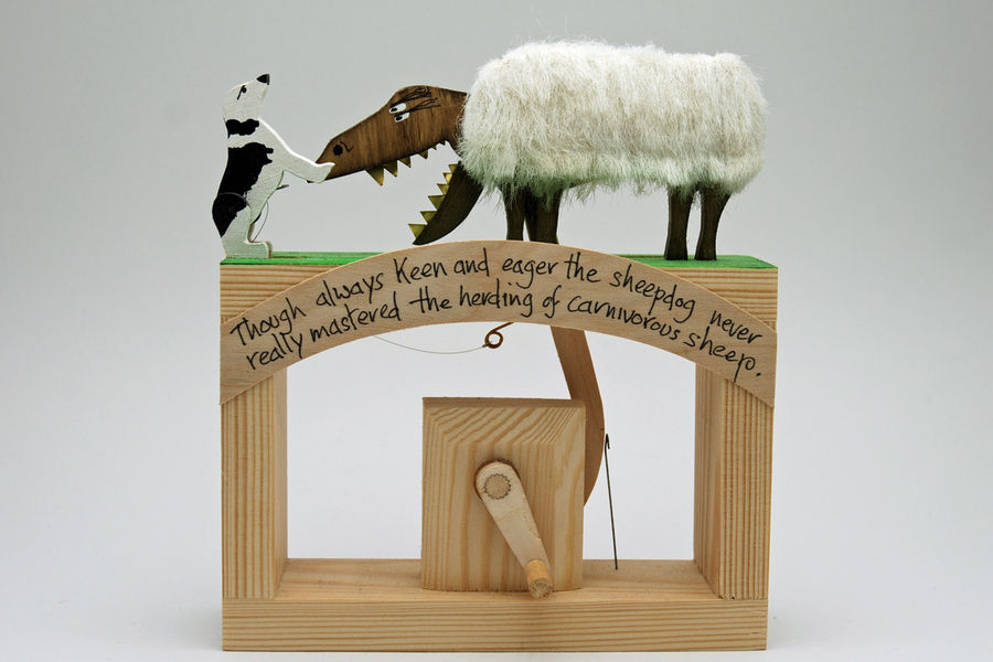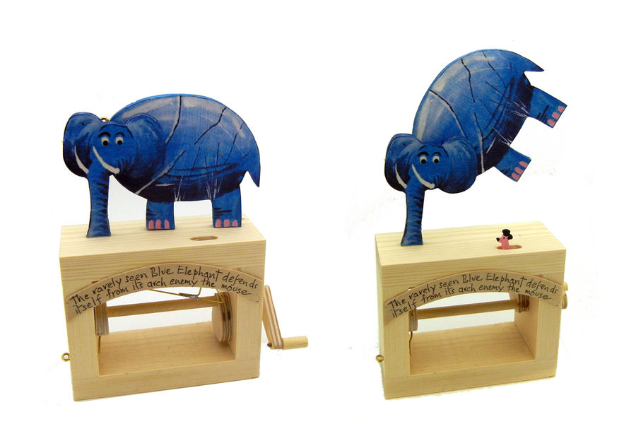Alexander Calder, Jean Tinguely and Sam Smith are the artists generally seen as the fathers of modern mechanical toy autmata. What is understood by this are movable toys and animated scenes for whom the mechanics are a vital part of the art object. Subversive sense of humour, and a feel for the ridiculous, maybe a 'typical British thing, are combined here with mechanical refinement. Each of the objects invites for interaction. The person discovering the automaton also discovers that his own interaction is an essential part of it and he is allowed to marvel and smile at the ironic reflex. These automata have their tongue firmly in their cheek and amuse through clever and well thought - out little surprises.