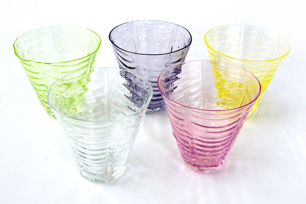 Drinking glass manufactured from thin glass. The glass was made by blowing into an imprint in wet clay. Since then Sia Mai has worked her way towards a pattern which she has created in a mould for mould-blowing. The glass is relatively thin, which condenses the color, making it seem visible almost only at the rim and in the lens on the side of the glass. This gives the product an element of lightness and elegance, which Sia Mai seeks in a drinking glass for use at everyday meals.