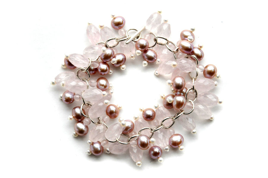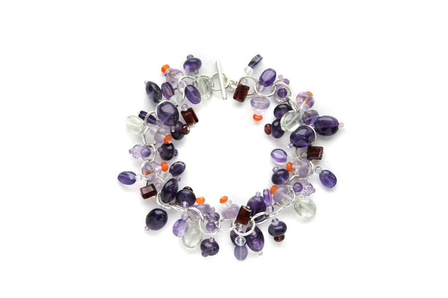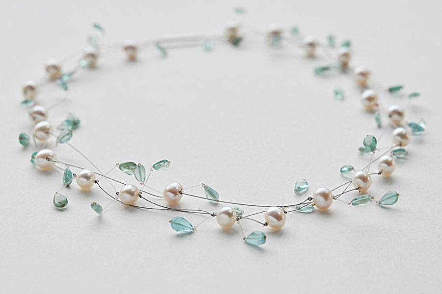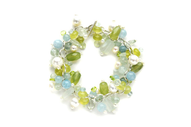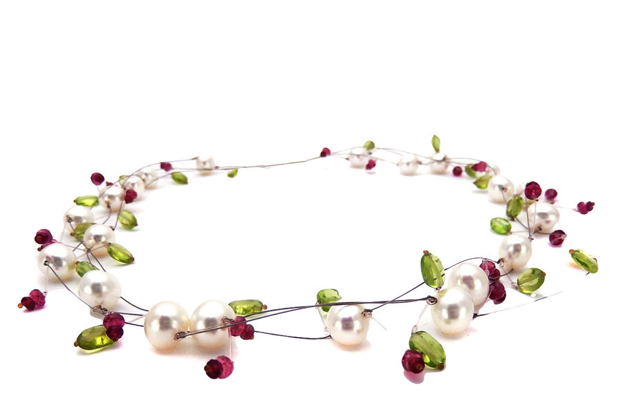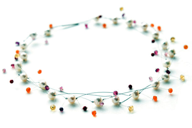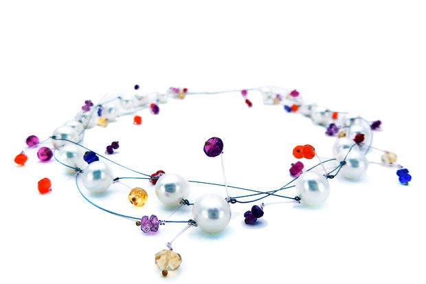 Multicoloured stones and freshwater pearls in a combination with handmade glass beads are combined playfully by jewellery designer Silja Bὂhm into chunky silver chains. The light touch and friendly harmony of her colour combinations add to the cheerful character of these imaginative pieces of jewellery.
