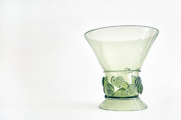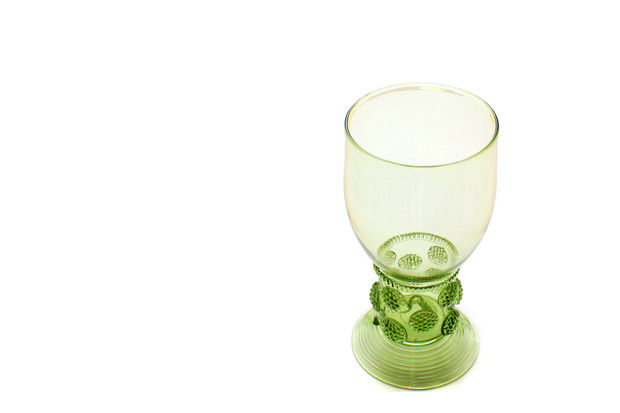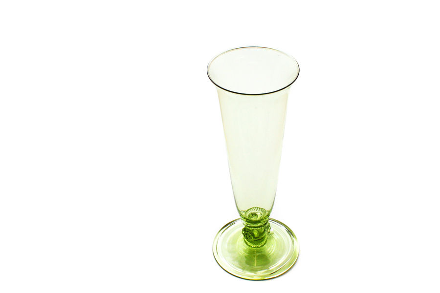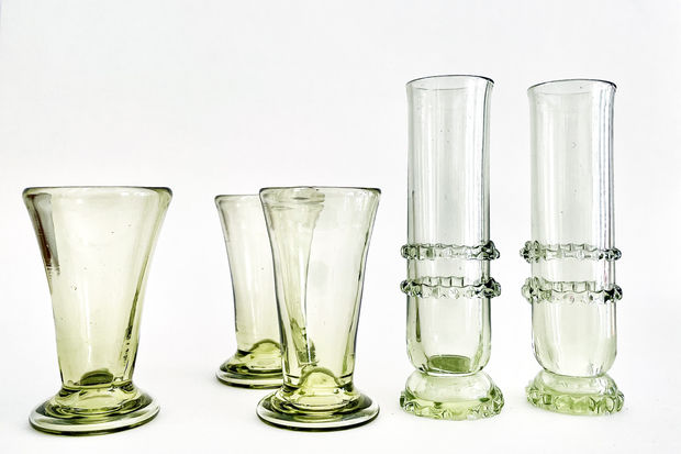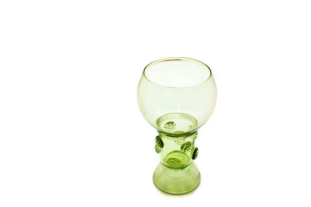 "Waldglas" is what these glasses are called. As the name suggests they come in a forest green colour but more than that they have been made since the 13th century in glassworks which were to be found in deepest middle- and westeuropean woods. It is there that the typical softly green glass with tiny internal bubbles was developed. And the useful was combined with the decorative. Crenated thread overlay which resembles pearl chains embrace the glass drinking cups more or less systematically. Nops, especially those of berries, decorate the feet of the wine glasses and cups. The effect is beautiful but makes the glass easy to handle, even with greasy hands!