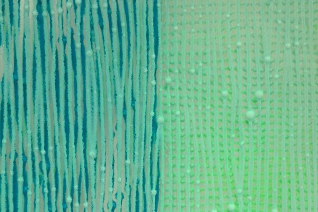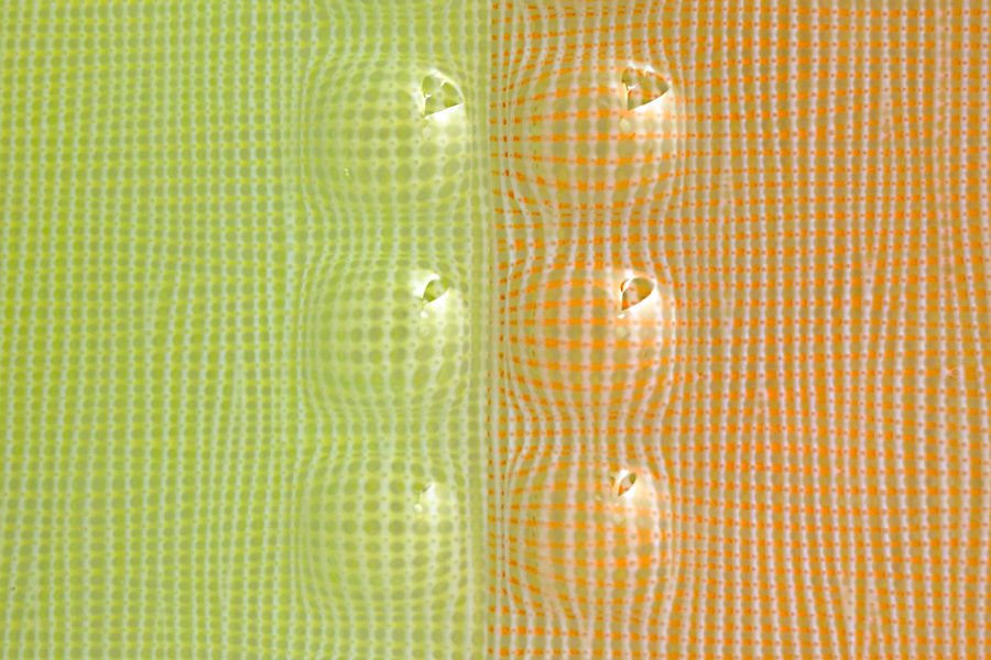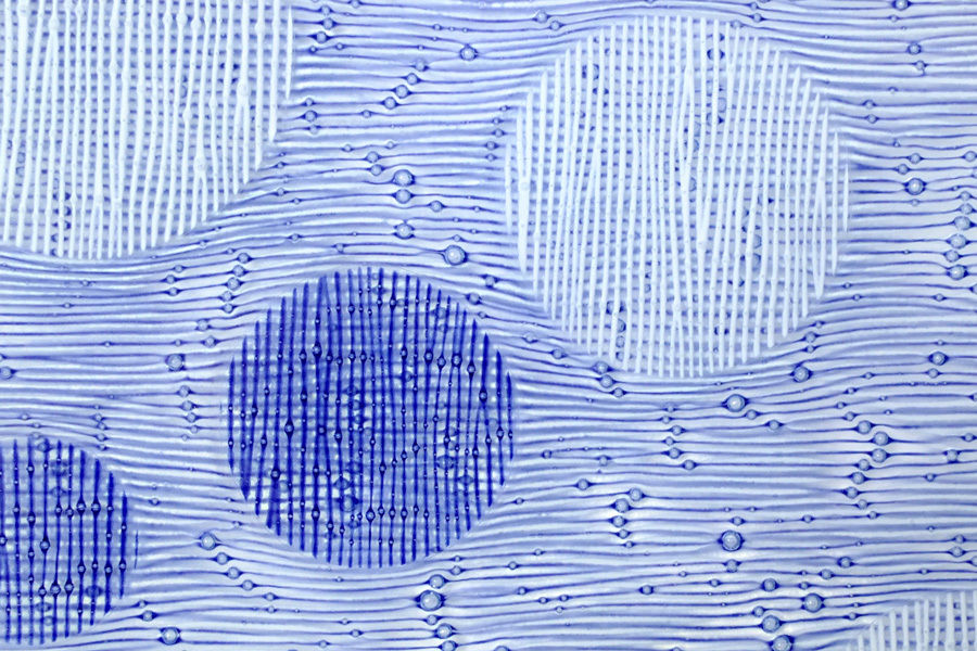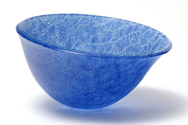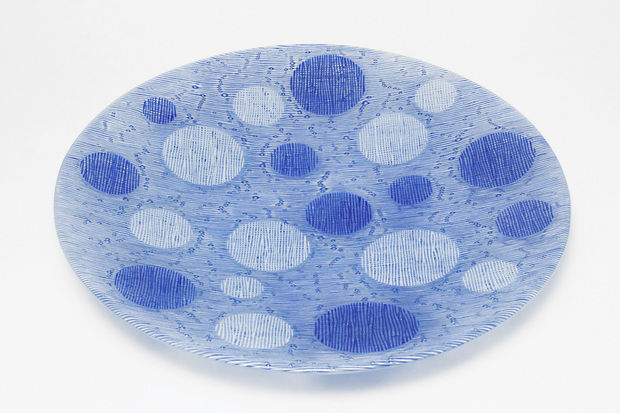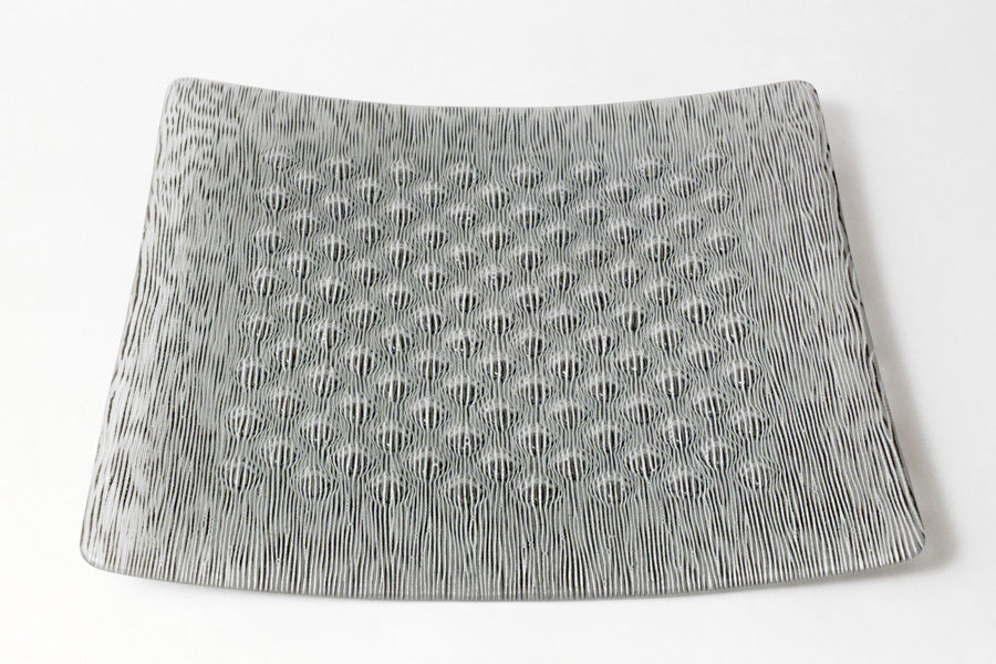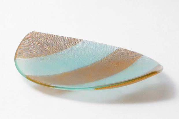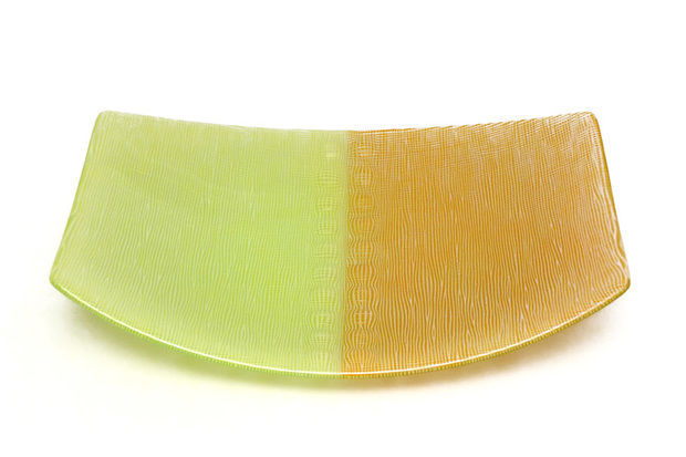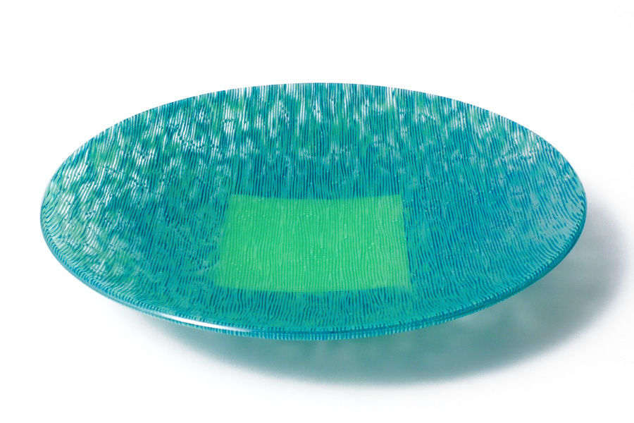 Since her studies in London, where she came into intensive contact with Japanese applied art, she has been deeply inspired by the complexity of Japanese textiles. In her fusing works, she achieves glass of an almost fabric-like quality by means of parallel or intersecting colour lines that are optically interwoven. Expressive variations are objects in which the glass surface is opened up and enlivened by grid structures. In another work cycle, the padded objects, additional air pockets are melted in during the fusing process – inspired by the reinforcing platelets of samurai armour. This gives the visual three-dimensionality of the surface its haptic quality.